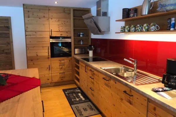 Altholzküchen mit Eichenarbeitsplatten und Glasrückwänden in Altrot .