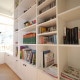 Schöne Einbautrennwand in hochwertiger Ausführung in weißem Strichlack. Die Türe im Bücherregal integriert übergehend in ein offenes Regal als Raumteiler.